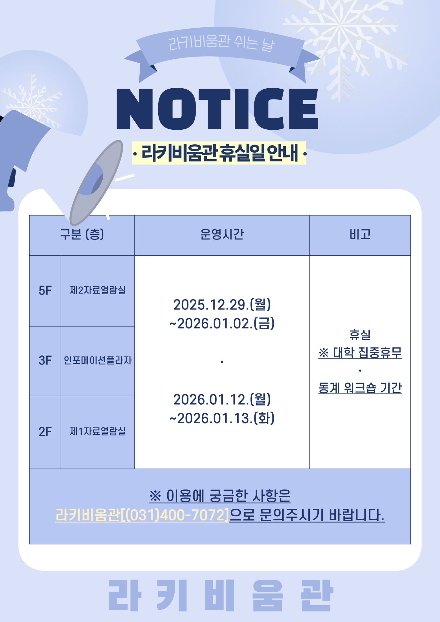 [공지] 2025학년도 2학기 동계방학 라키비움관 휴관일 안내