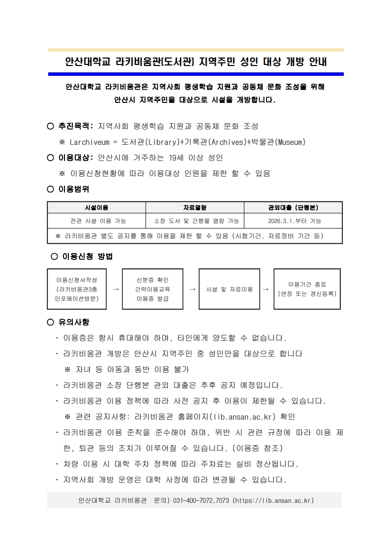 [공지] 안산대학교 라키비움관(도서관) 지역주민 성인 대상 개방 안내