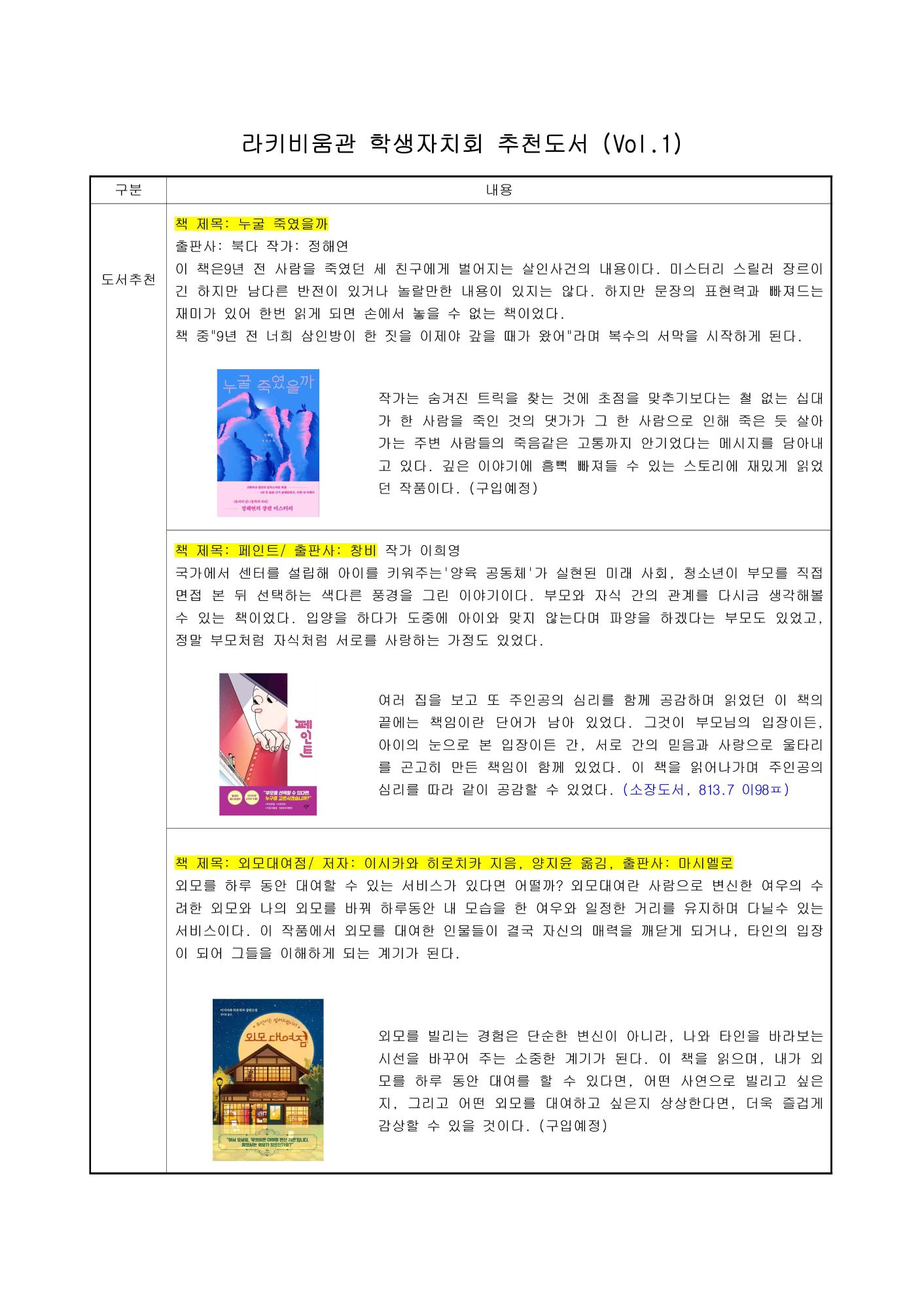 라키비움관 학생자치회 추천도서 (Vol.1)